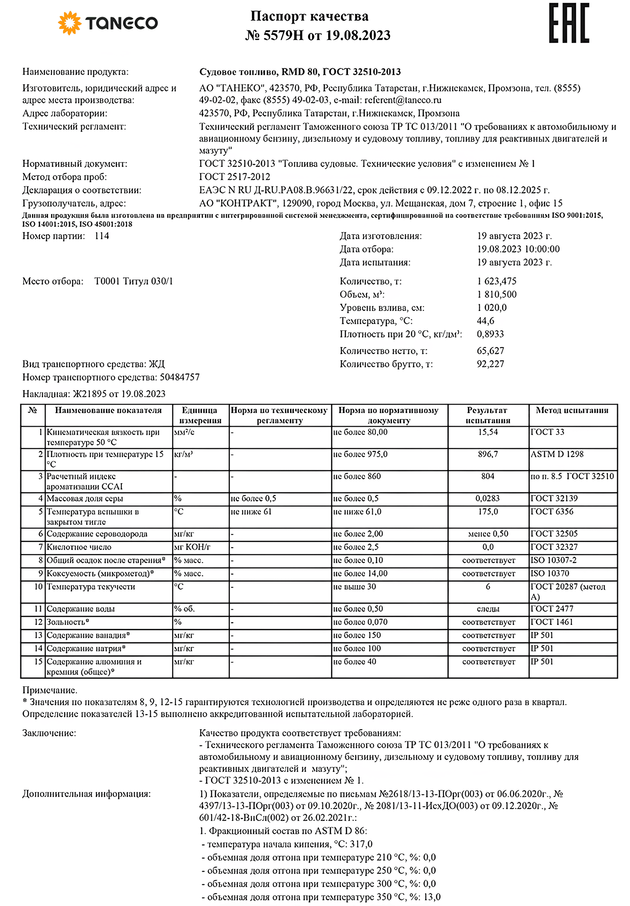 * Данные соответствуют среднестатистическим показателям судового маловязкого топлива вида II ведущих российских НПЗ. Конкретные значения могут незначительно отличаться в зависимости от производителя и партии. Топливо соответствует требованиям ТР ТС 013/2011 "О требованиях к автомобильному и авиационному бензину, дизельному и судовому топливу, топливу для реактивных двигателей и мазуту".
