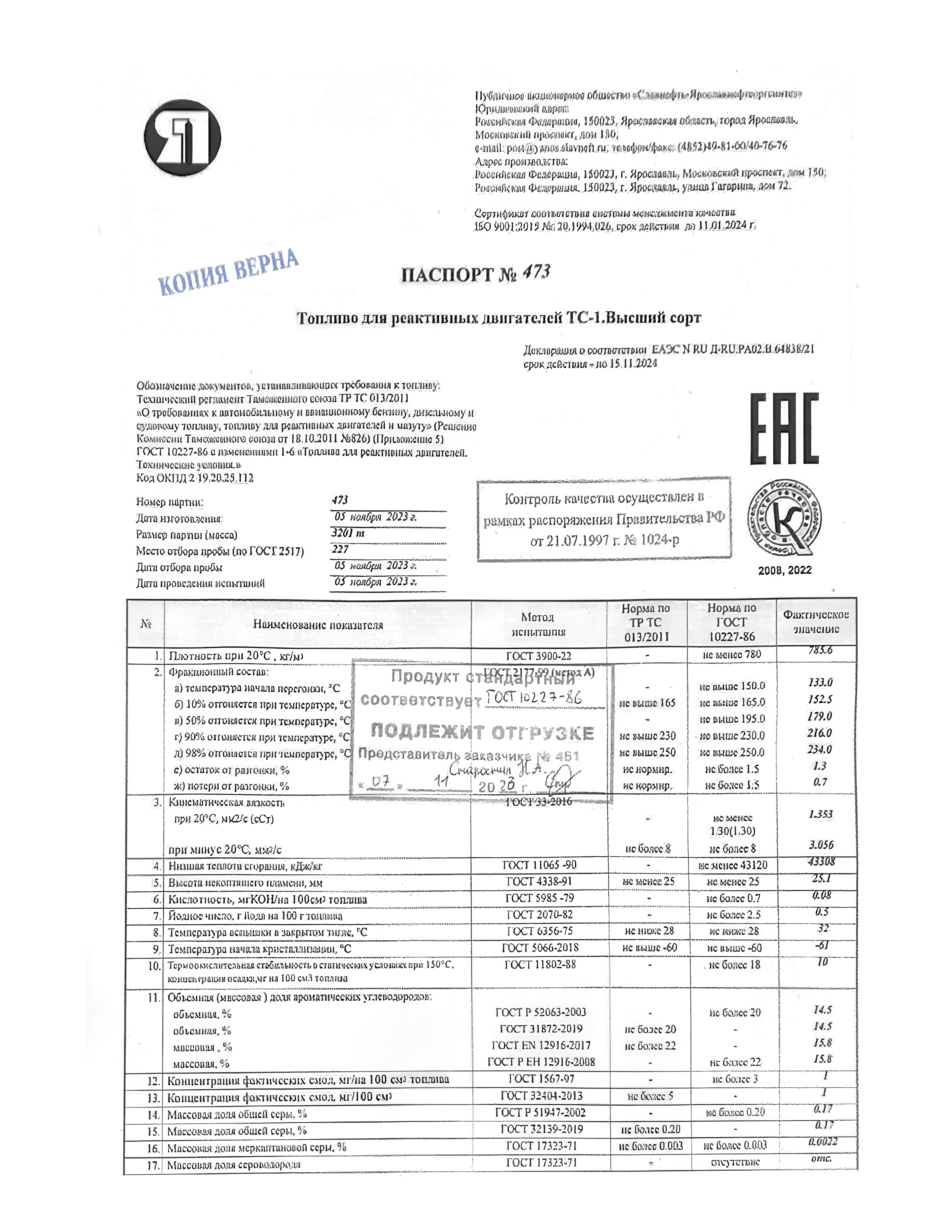 | Наименование показателя | Единица измерения | Норма по ГОСТ 10585-2013 | Фактическое значение |